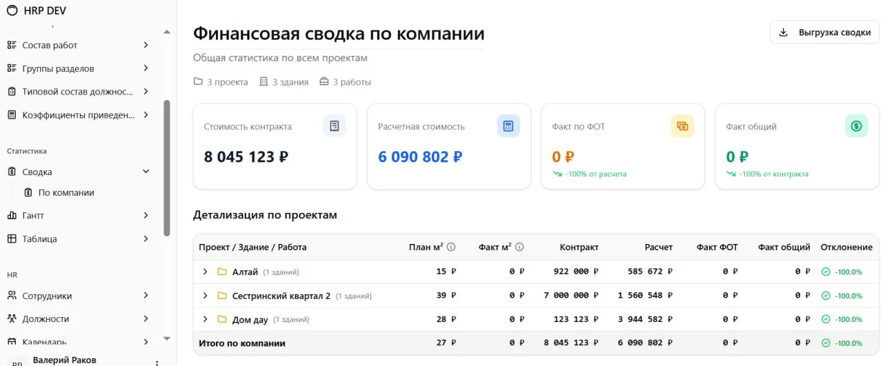 HRP автоматически рассчитывает загрузку проектировщиков и себестоимость контрактов. Полная прозрачность для руководителя в одном окне.